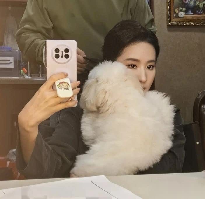 刘亦菲一手撩着头发,一手拿着手机自拍。她坐在沙发上,爱犬“哈哈”从背后靠过来,跟她一起同框出镜。